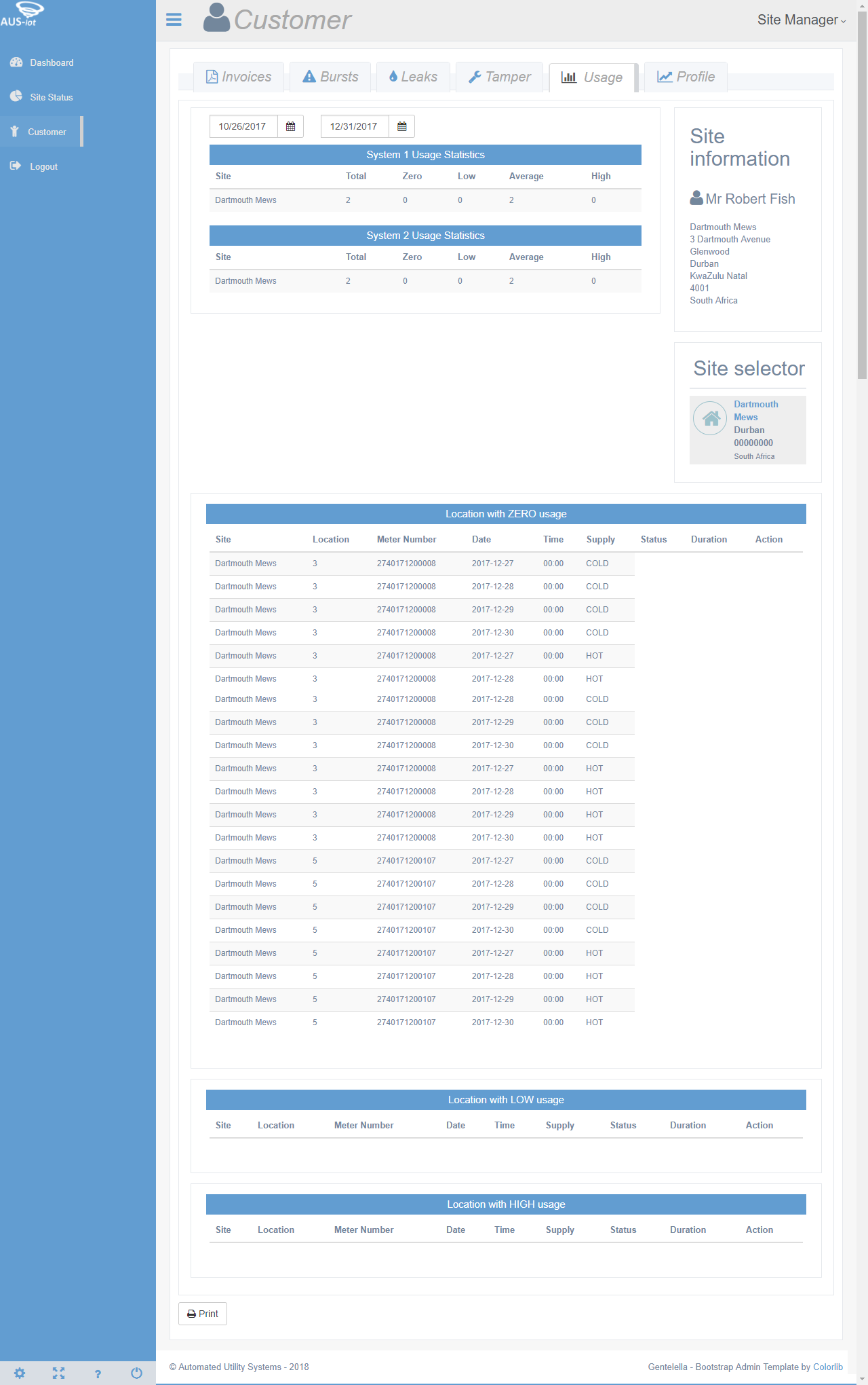 The Automated Utility Systems information pertaining to: